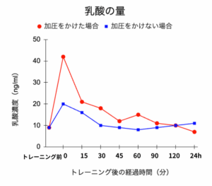 加圧した場合は、しない場合の最大約2倍の乳酸が筋肉内にたまる。
