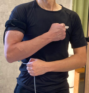 加圧トレーニング中は、腕と脚の付け根に専用のベルトを巻き、血流を制限しながらトレーニングを行います。